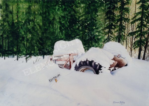 It was -28C and I was trying to photograph a cross-country ski race. Just before my frozen fingers and frozen shutter gave up I saw this tractor snuggled in the snow beside the biathlon sign. ** 16 X 20