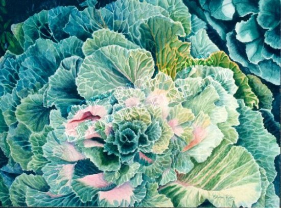 I always like to have a small challenging image to work on that is easy to take on trips. This decorative cabbage began while visiting family in Vancouver and traveled many other places over the following 1 1/2 years until completion. The array of colours and shading are what I found appealing.